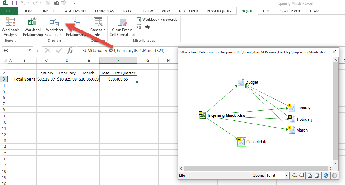 - If we go one layer deeper we can see that the previous ranges are all precedents to the ranges (January!B2:B23, February!B2:B23 & March!B2:B23).