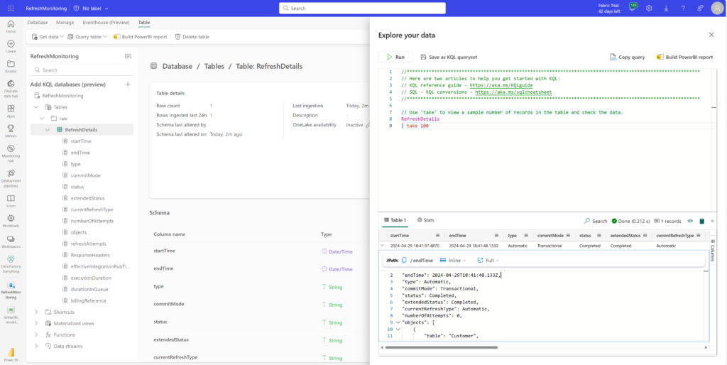 Jumping over to the KQL Database, since the table has not been created previously, the set-or-append command will first create the table on first run and in subsequent refreshes will then append results to the table.