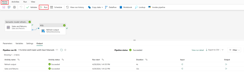 One final step is visit the Home tab and select the Run option (likely you'll also need to save). Hopefully you'll notice within the Output section that both activities have succesfully completed.