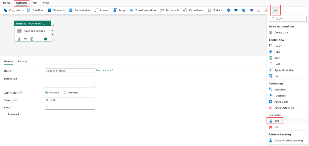 Select the Activities tab and then the more activities ellipses (...), within the activities list navigate to the Transform group and select the KQL activity.