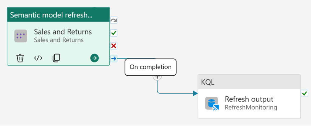 With the KQL activity now added to the canvas, drag-and-drop the On completion conditional path between the Semantic model refresh and KQL activities. This will ensure you're able to capture both successful and unsuccessful refresh activities.