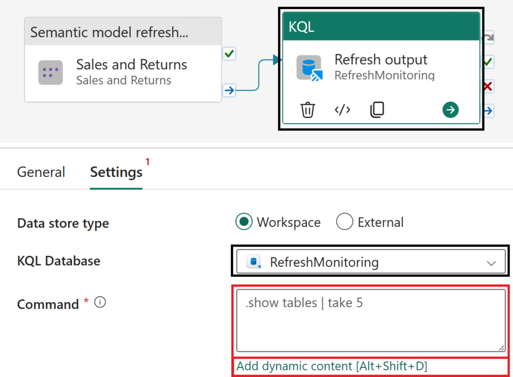 Select the KQL activity, navigate to Settings and choose your configured KQL Database in a Fabric Workspace (data store type). After configuring the settings, select the Command parameter input box and the Add dynamic content option once visible to insert a dynamic KQL query using the semantic model refresh activity's output.